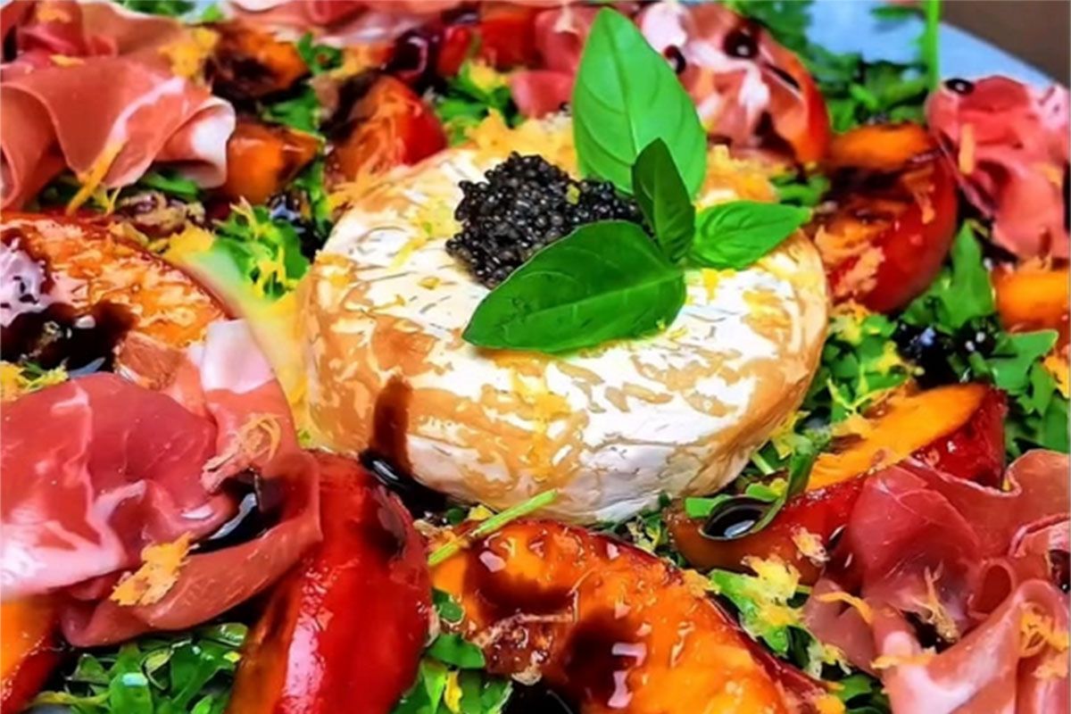 - На тарелку: рукола, прошутто, тёплые персики, в центр — бри.